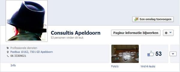 U kunt ons "liken" op "Consultis Apeldoorn". Op dit moment is er nog weinig content, daar gaan we de komende weken aan werken. Ondertussen kunt u natuurlijk uw vragen (van algemene aard) op onze pagina plaatsen. Wij zullen dan in algemene termen onze antwoorden toevoegen.